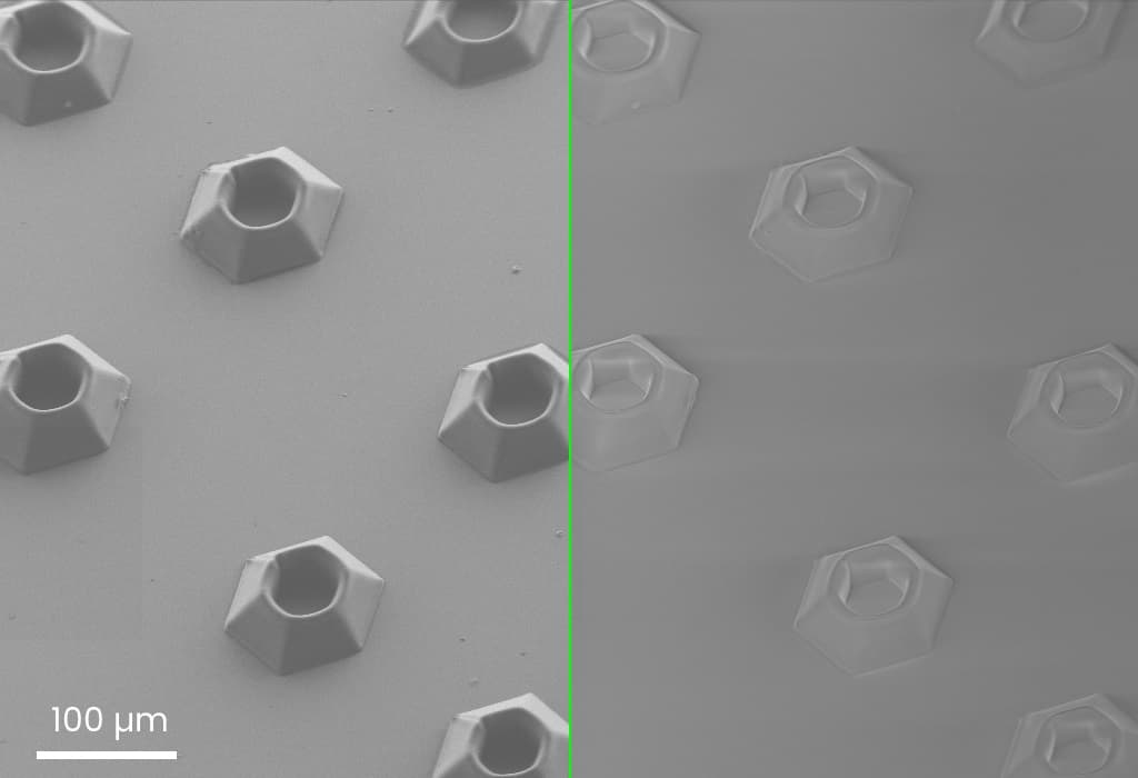 Array of OrmoComp micro-wells for single cell high resolution imaging - Realized with microFAB-3D.Advanced, in a collaboration with R. Galland, CNRS Bordeaux, France.