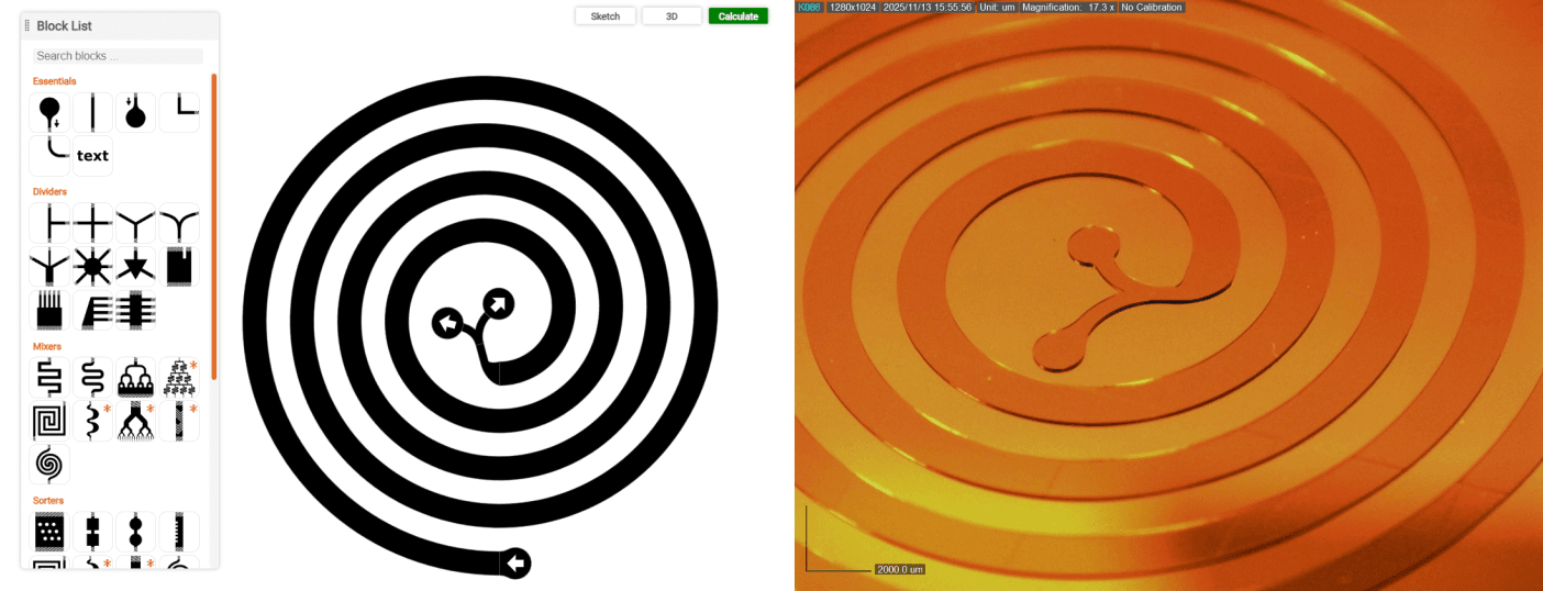 FLUI'DEVICE stands out thanks to its extensive library of modules and predefined designs, inspired by scientific publications, allowing users to start from an existing model and adapt it. Its intuitive drag-and-drop interface, combined with a multitude of tutorials, makes it particularly easy to learn, even for beginners in microfluidics.