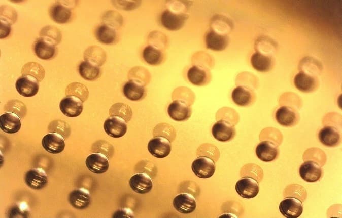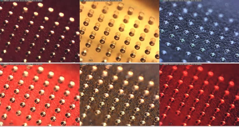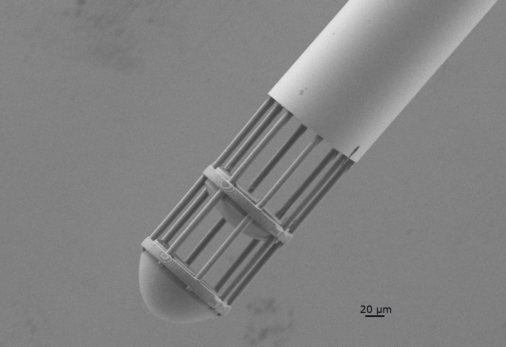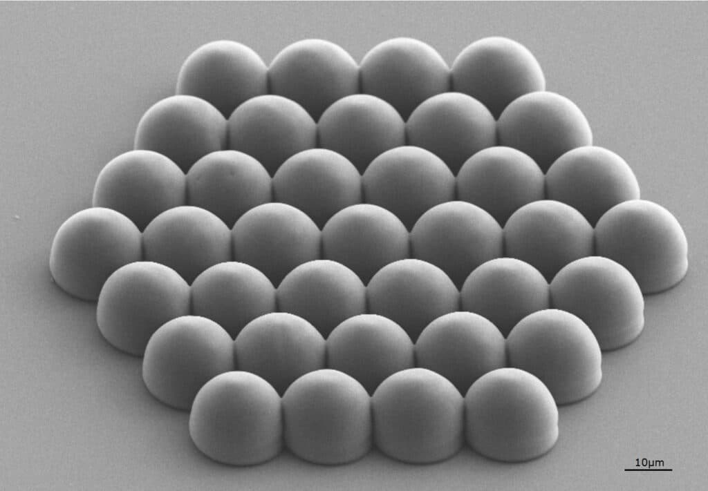 Micro-lenses spaced 100 µm and 200 µm over the tip of an optical fiber for transceivers applications. Pillars were realized at low resolution for faster printing, and lenses at high resolution to get a smooth surface. - Realized with microFAB-3D.Advanced